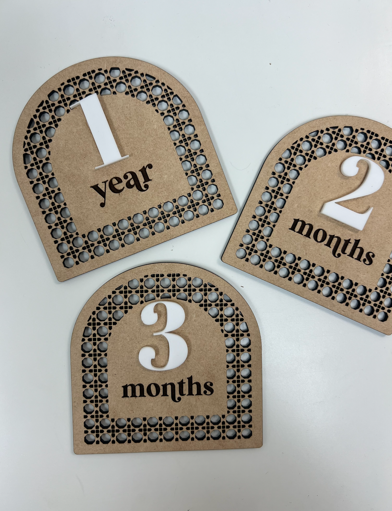 Each wooden card is laser cut with the rattan pattern and engraved on each plate, along with the acrylic number that pops out.